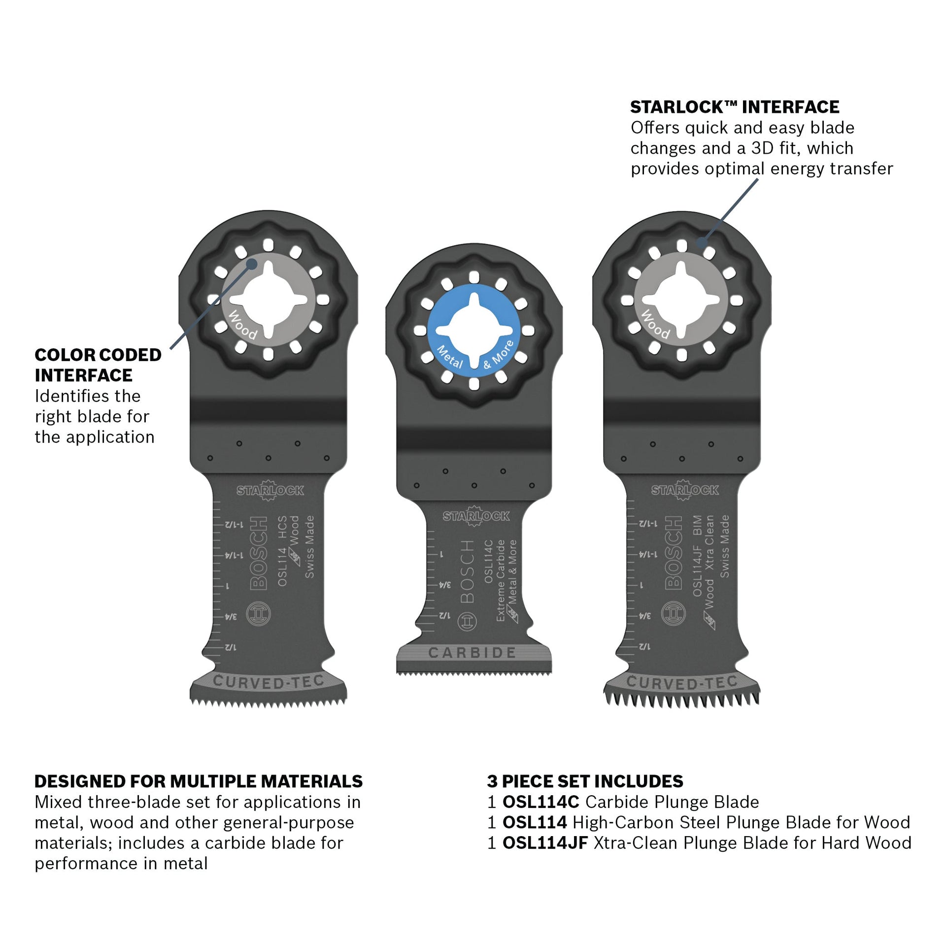 - Includes OSL114C 1-1/4-in. Carbide Plunge Blade; OSL114 1-1/4-in. High-Carbon Steel Plunge Blade for wood; and OSL114JF 1-1/4-in.Xtra Clean Plunge Blade for hard wood