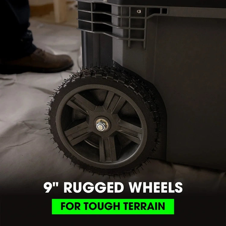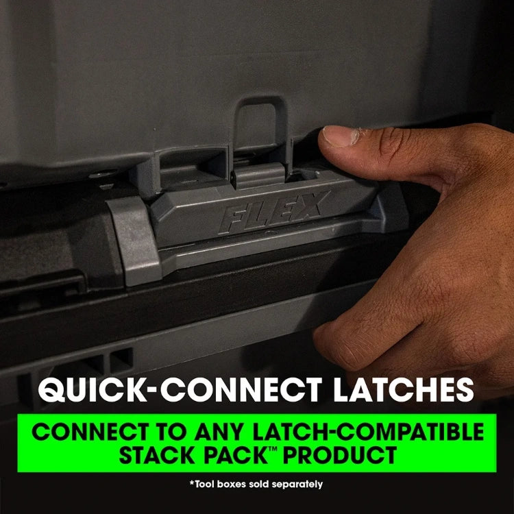 Roll everything you need to and from the jobsite with the FLEX STACK PACK™ 1-Drawer Rolling Tool Box. Its removable telescoping handle allows for easy transport in a covered truck bed, and you can tackle any terrain with its rugged 9-inch rubber wheels. This single-drawer toolbox features auto-locking mechanisms that securely close and prevent the drawer from opening during transport while durable stainless steel rails ensure the drawer opens and closes smoothly over a long life. The drawer offers a 70-pound weight capacity while the box can support up to 250 pounds of weight stacked onto it. Quick-connect latches offer fast and effortless connectivity so you can quickly stack and unstack toolboxes for a fully customized STACK PACK™ configuration to roll with you from job to job. It’s protected by a one-year limited warranty when registered within 30 days of purchase at registermyflex.com.