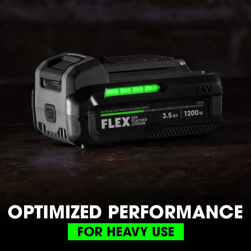 200% more power with 24V lithium, 300% longer battery life with THERMA-TECH™+ heat management, 100% faster charging; 100% cross-compatible with all FLEX 24V tools and chargers