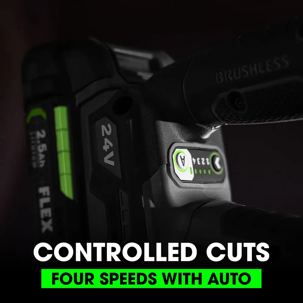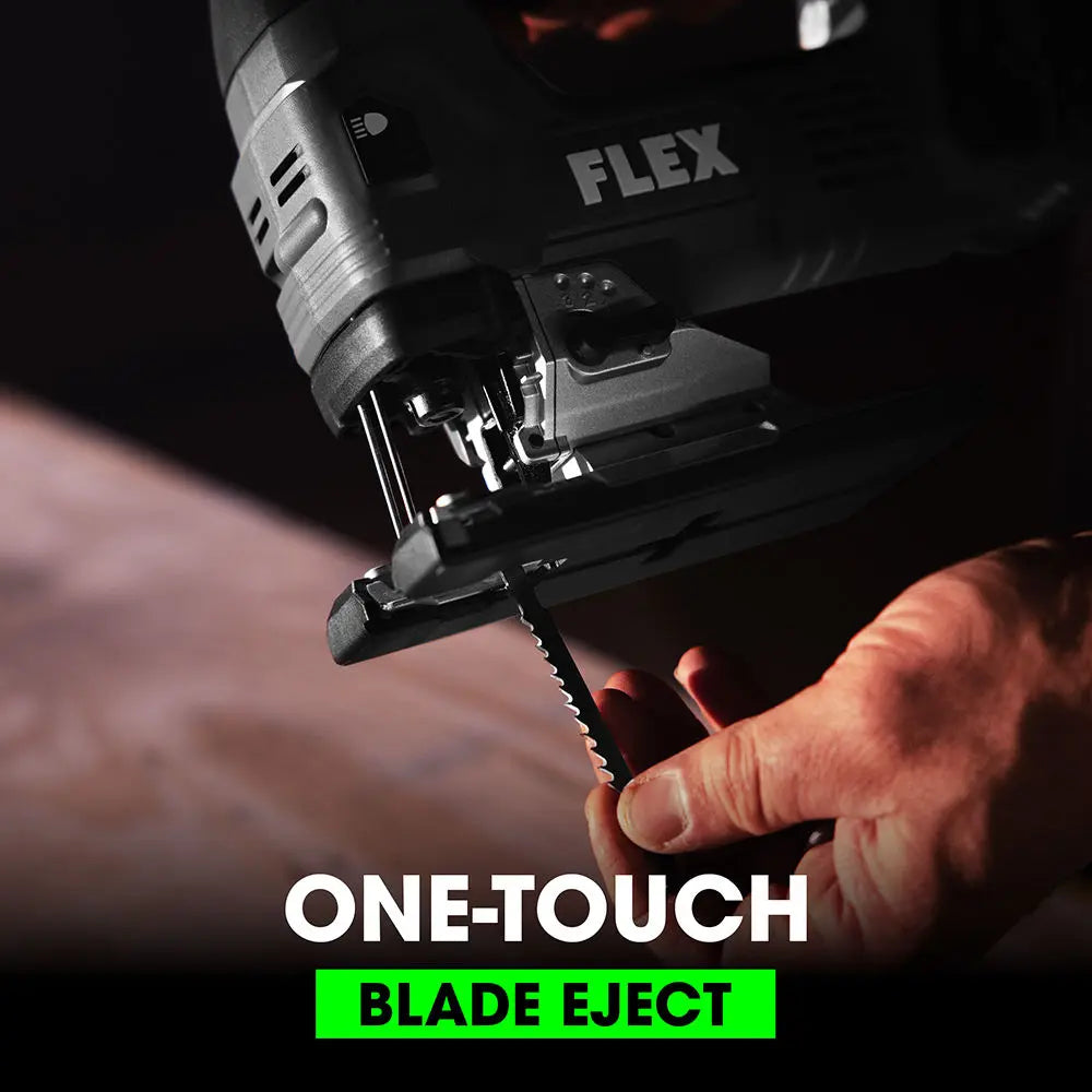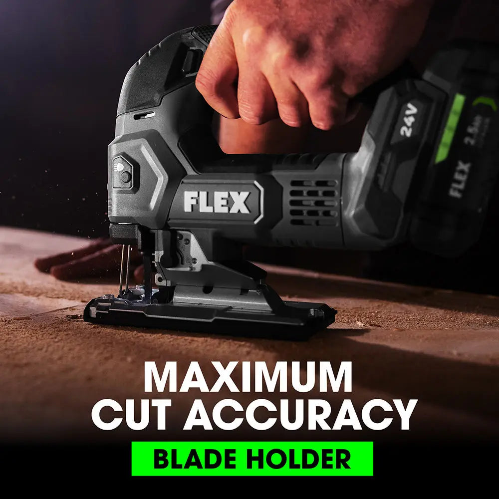 Cut with ultimate precision and control with the FLEX 24V Brushless D-Handle Jigsaw. It delivers four adaptable speeds and auto mode. Dual-guide blade holder provides accuracy and a LED light ensures confidence in every cut. Changing blades is fast and easy using the one-touch blade eject. And this jigsaw also delivering the FLEX Advantage: unmatched 24V battery power, runtime and faster charging (battery and charger sold separately). All this, protected by a dependable 5-year warranty.
