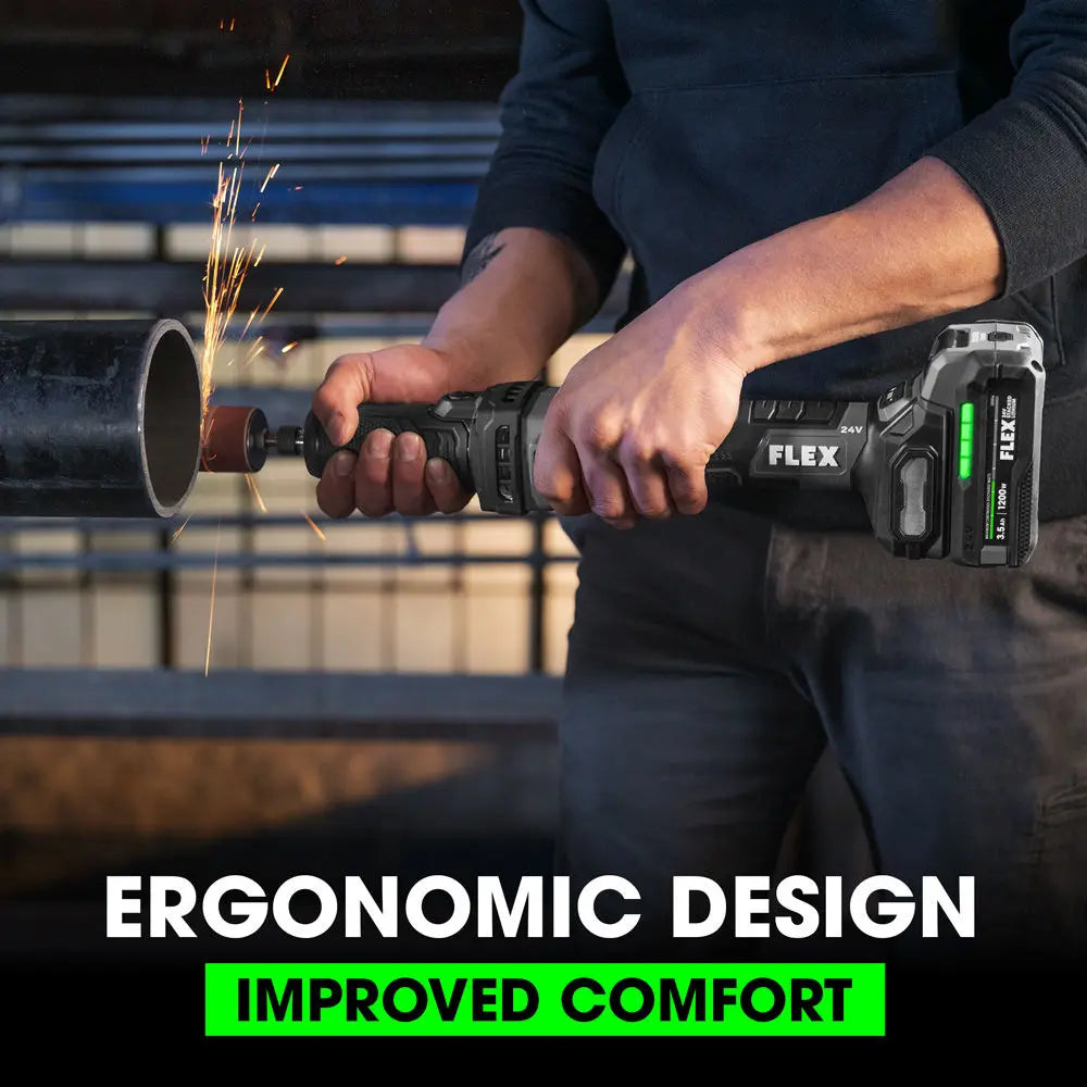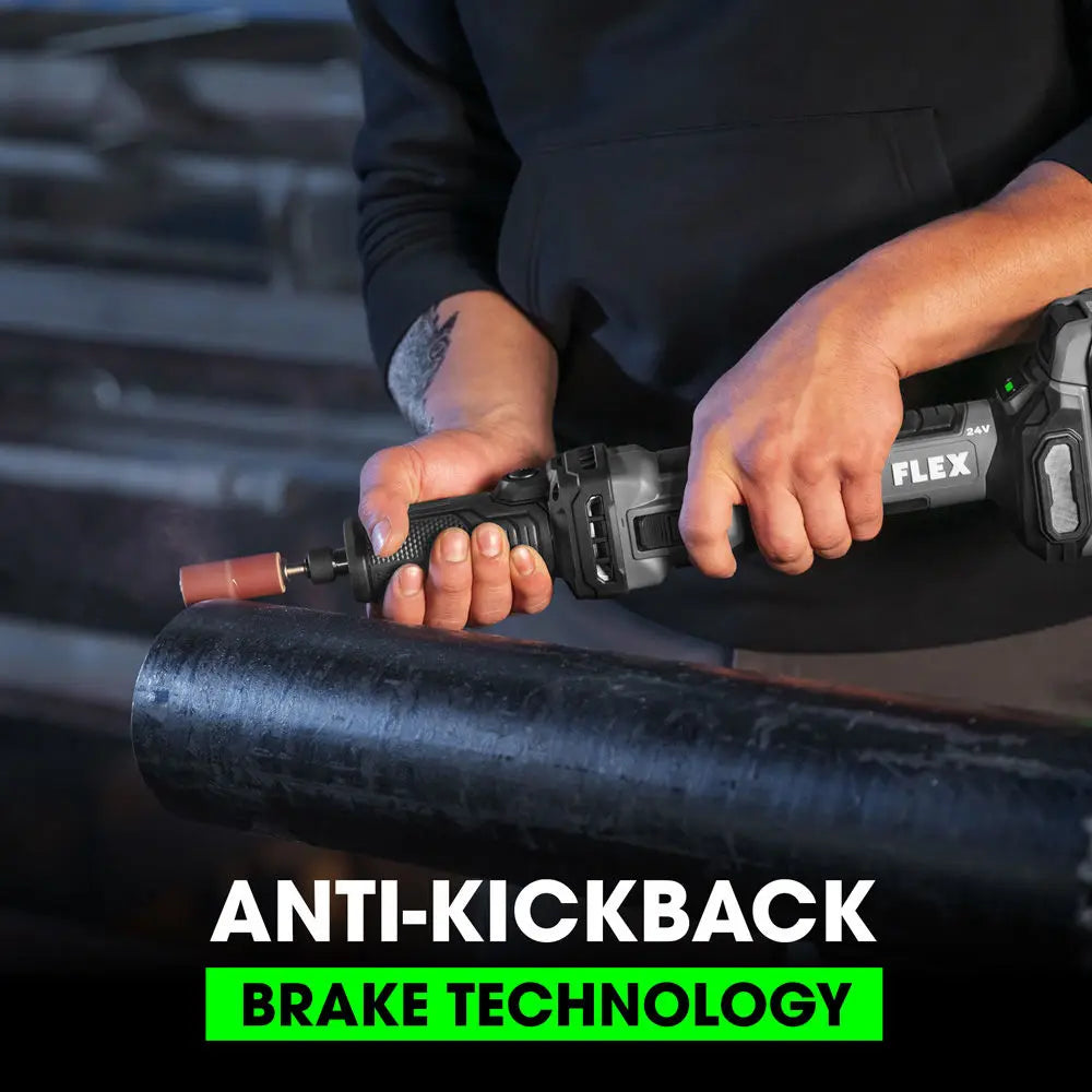 Grind metals and welds in tight spaces where angle grinders can’t go with the FLEX 24V Die Grinder. This electric die grinder delivers up to 28,000 RPMs complete with adjustable speeds to match the application at hand for optimal precision. It’s built with a slim ergonomic design for comfort that lasts for hours. A spindle lock makes for easy accessory changes. Carve wood, marble, and granite, or de-burr metal with ease using the FLEX 24V Die Grinder. This cordless die grinder delivers the FLEX Advantage of unmatched battery power, runtime, and fast charging (batteries and chargers sold separately). It’s all protected by the FLEX Limited Lifetime Warranty when registered within 30 days of purchase at registermyFLEX.com through December 31, 2024.