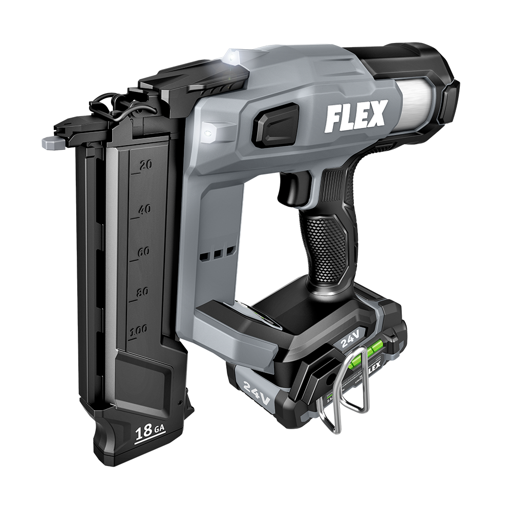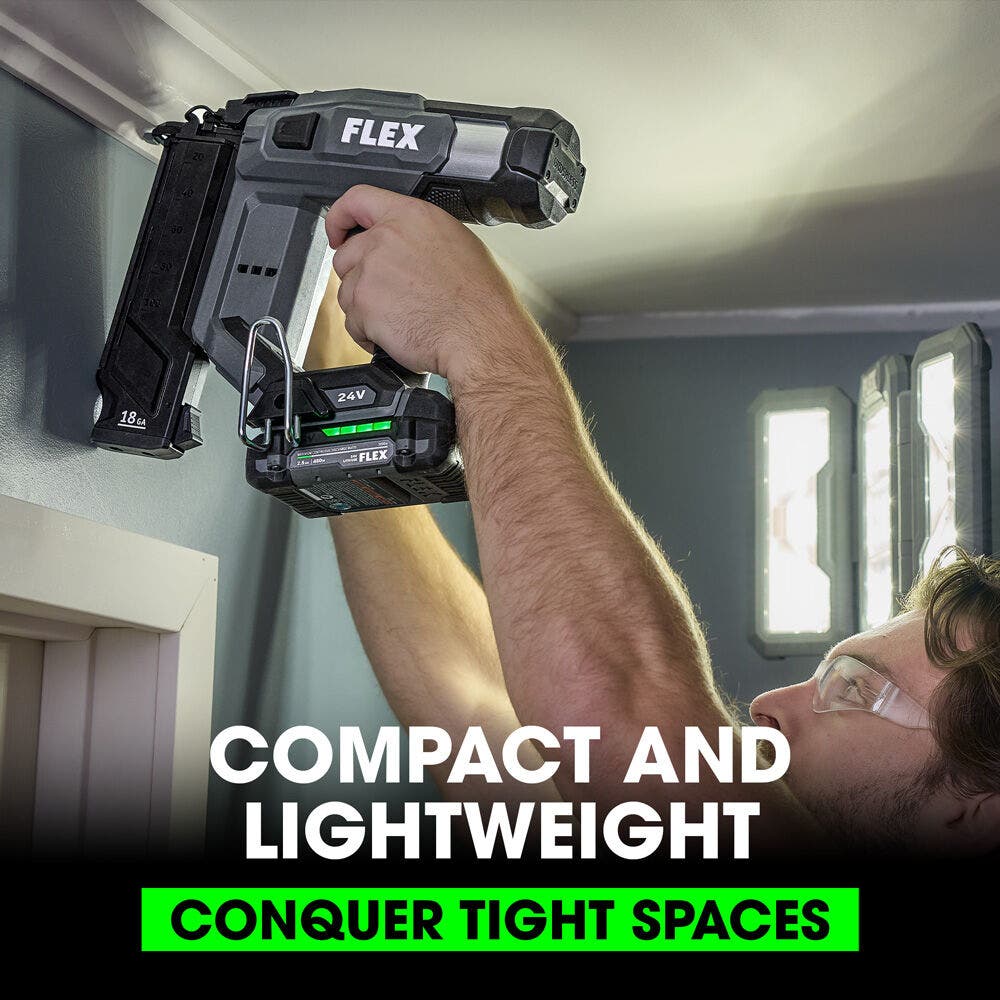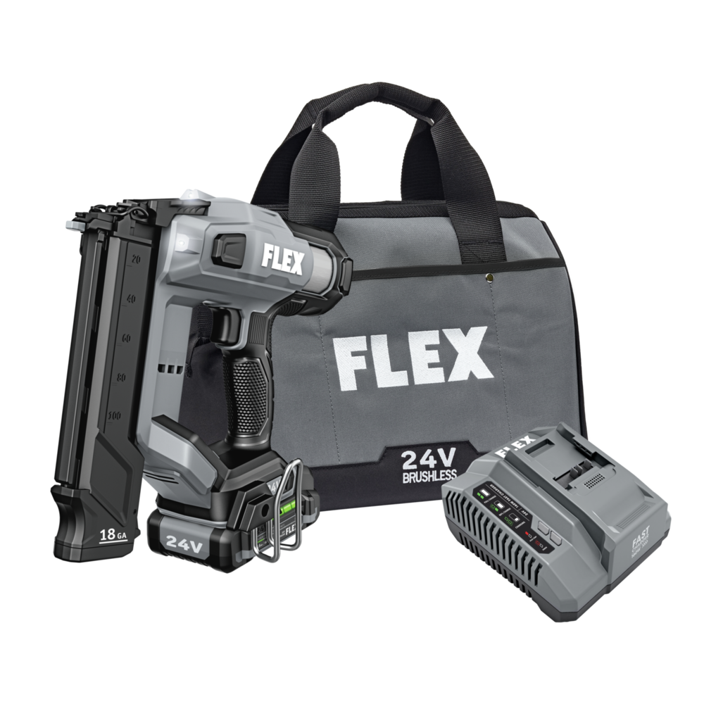 Power through finishing jobs without the hassle of hoses and compressors with the FLEX 24V Brushless 18Ga Brad Nailer. This cordless brad nailer delivers high-speed power by driving up to 3 nails per second with zero ramp up time. It drives up to 2,200 nails on a single charge with a 2.5Ah lithium-ion battery for extended runtime. The nail gun features an ergonomic quick depth adjustment lever to easily set the ideal nailing depth when driving fasteners, and its triple LED light delivers shadow-free illumination for better visibility in dark work areas. The cordless nail gun toggles between bump and sequential firing modes and has a nail indicator to easily see how many nails remain in the magazine. Dry-fire lockout avoids blank firing and damage to your work when the nail supply is exhausted. Tool-free jam clearance allows you to quickly clear jammed nails without tools for maximum efficiency when you’re on the job. The cordless nailer is compact and lightweight to conquer tight spaces with minimal fatigue. Its heavy-duty belt clip can be mounted on either side of the tool and features a lead-in profile. The finish nailer accepts 5/8-inch to 2-1/8-inch 18-gauge fasteners. This cordless nailer delivers the FLEX Advantage of unmatched battery power, runtime, and fast charging. Kit includes the 18Ga Brad Nailer, 2.5Ah lithium battery, 160W Fast Charger, belt clip, (3) no-mar tips, and a FLEX bag. It’s all protected by the FLEX Limited Lifetime Warranty when registered within 30 days of purchase at registermyFLEX.com through December 31, 2024.