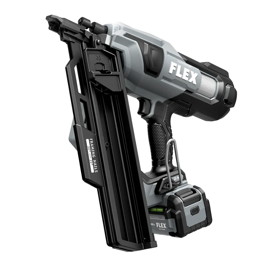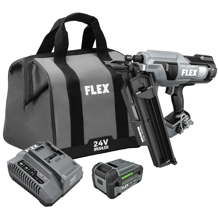 Power through framing jobs without the hassle of hoses and compressors with the FLEX 24V Brushless 21° Framing Nailer. This cordless framing nailer delivers high-speed power by driving up to 3 nails per second with zero ramp up time. It drives up to 1,100 nails on a single charge with a 5.0Ah lithium-ion battery for extended runtime. The nail gun features a power adjustment dial to easily set the ideal depth when driving fasteners, and its dual LED worklight delivers better visibility in dark work areas. The cordless nail gun toggles between bump and sequential firing modes and has a nail indicator to easily see how many nails remain in the magazine. Dry-fire lockout avoids blank firing and damage to your work when the nail supply is exhausted. Its heavy-duty belt clip can be mounted on either side of the tool and features a lead-in profile. A convenient pivoting rafter hook allows additional easy storage when not in use. The framing nailer accepts 2-inch to 3-1/2-inch fasteners. This cordless nailer delivers the FLEX Advantage of unmatched battery power, runtime, and fast charging. Kit includes the 21° Framing Nailer, 5.0Ah lithium battery, 160W Fast Charger, rafter hook, belt clip, (3) no-mar tips, and a FLEX bag. It’s all protected by the FLEX Limited Lifetime Warranty when registered within 30 days of purchase at registermyFLEX.com through December 31, 2024.