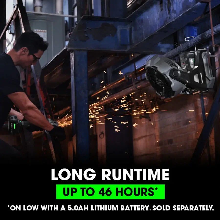 Up to 46 hours runtime on low with 5.0Ah Lithium battery for all day operation *Battery sold separately