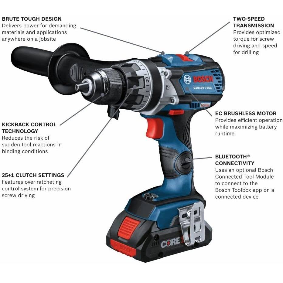 BOSCH GSB18V-755CB25 18V Brute Tough Hammer Drill w/ 2 4.0Ah Core Compact Batteries - GSB18V-755CB25
