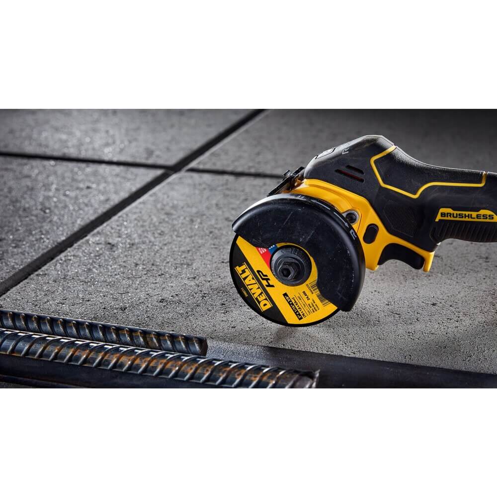 Cut a wide range of materials with the 20V MAX* XR® Brushless 3 in. Cut-Off Tool. With a no-load speed of 20,000 rpm, this durable tool is designed to cut through a variety of materials like metal, tile, stone, plastic, and drywall/fiber cement. You won't waste time hunting for a hex wrench thanks to the onboard storage and spindle lock which enable quick wheel changes. With both forward and reverse capability, you can conveniently change the direction of the cut depending on the application. The included dust shroud with adjustable shoe and AirLock™ connection allows for convenient attachment to DEWALT extractors, while the integrated LED lets you work in dark spaces. This versatile tool is Lanyard Ready™ Capable to protect against drops, and is Chip-Ready to allow tracking via the TOOL CONNECT™ System (chip and lanyard sold separately).