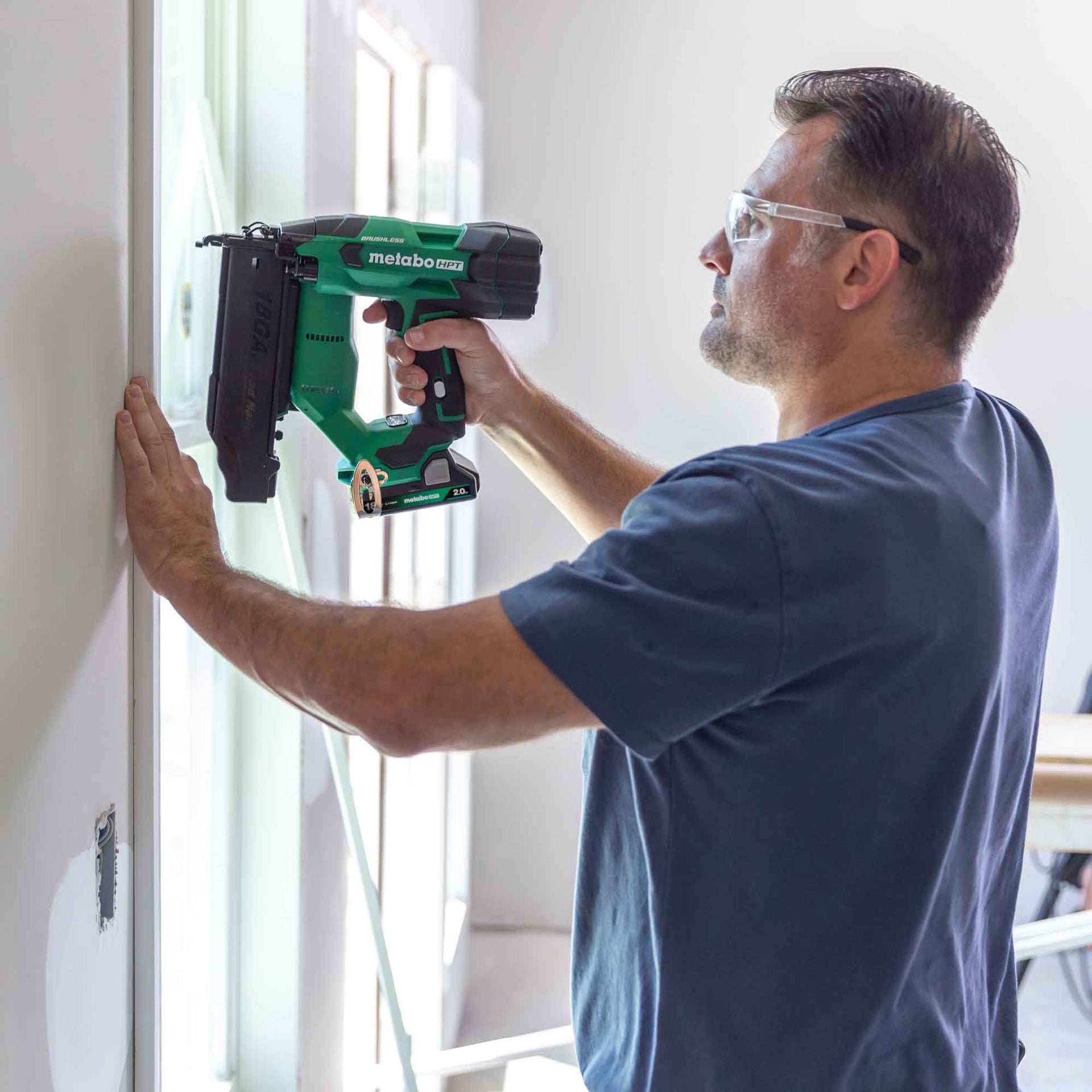 The Pro Preferred Brand of Pneumatic Nailers introduces the 18V Brushless Compact Cordless 18-Ga Brad Nailer (model NT1850DFT) that is 30% more compact and 31% lighter than the previous model. Now, with a 2.0Ah battery with fuel gauge, it delivers a driving speed of up to 2 nails per second, saving valuable time and increasing productivity. Forget the hassle of having to drag long hoses or compressors around, or having to deal with gas cartridges, and GO cordless! This 18 gauge Brad Nailer delivers a similar feel to a pneumatic nailer thanks to Metabo HPT’s unique Air Spring Drive System. Combine the pneumatic-like feel with the convenience and power of the 18V or MultiVolt battery, and this cordless Brad Nailer works all day long, driving 5/8” to 2” nails. Get 1300 nails per charge with the included 2.0Ah compact battery. Backed by Metabo HPT’s Lifetime Lithium-Ion tool body warranty, it’s a safe bet for the long haul. The 18V 18-Ga Cordless Brad Nailer is a part of the expanding MultiVolt System of 18-Volt and 36-Volt power tools from Metabo HPT. GO lighter with 18V batteries or GO longer with the unique MultiVolt battery that works on both 18V and 36V tools to double your runtime for up to 8.0Ah of run time per charge for more power on the GO.