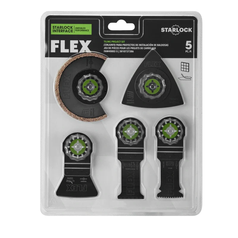 Tiling jobs stack best when you start fully equipped to expertly corner and cleave. The FLEX Tiling Project accessory set provides greater tiling advantage with a wide range of versatile blades for the FLEX Oscillating Multi-Tool. Each attaches firmly with the performance-enhancing Starlock Interface for total tiling domination. Prepare to cut, grind, scrape with unmatched efficiency and precision till every last tile is laid.