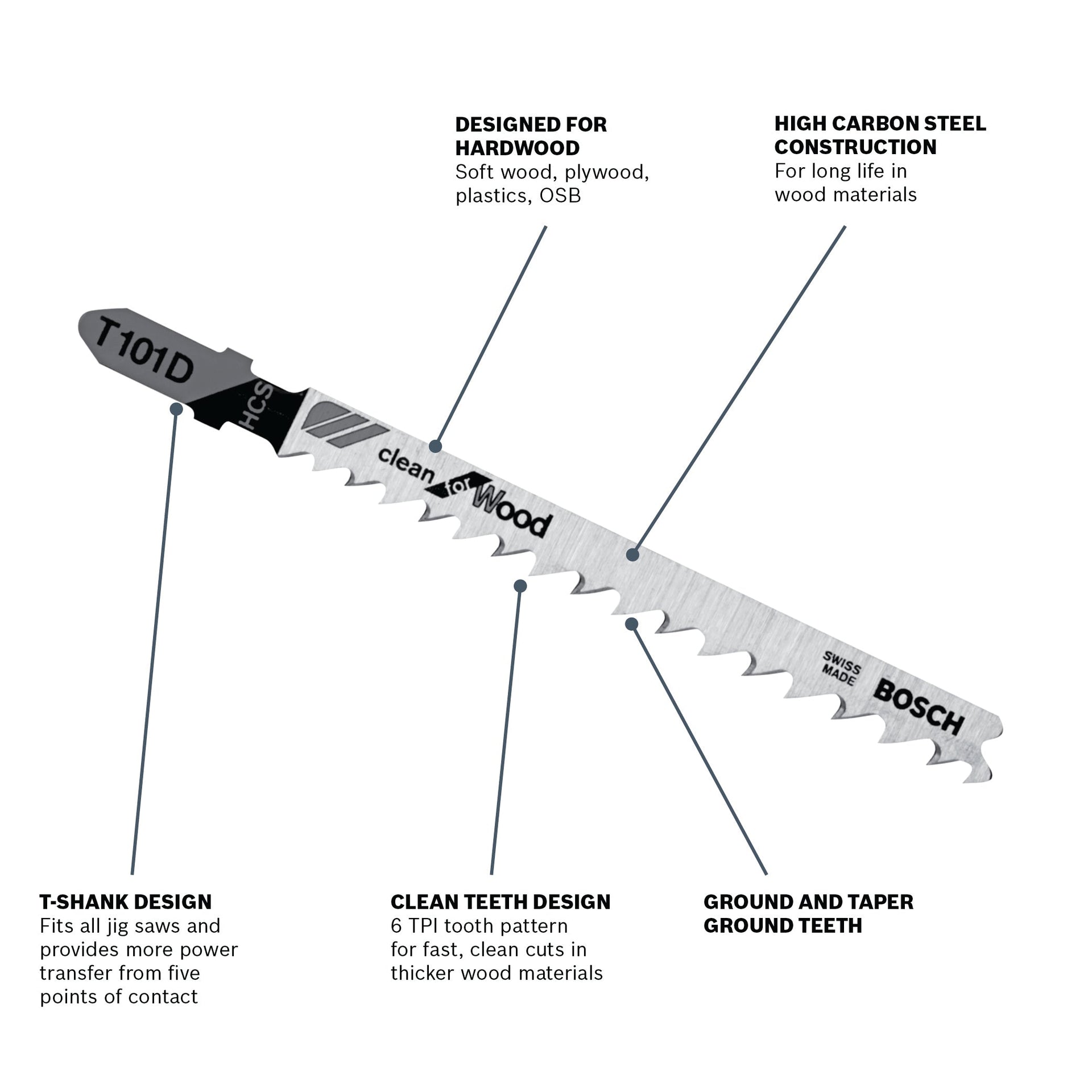 The Bosch T101D 5-piece Clean for Wood Jig Saw Blade Set features clean-cut blades designed for fast, clean and straight cuts in hard and soft wood, plywood, plastics and OSB, with thicknesses from 1/4 In. In. to 2-3/8 In. thick. These blades tackle common wood projects and laminate cutting. Made of high-carbon steel, they deliver high performance with precise, clean cuts. They have a 0.06 In. wide body, engineered to prevent blade deflection for stable true cuts. And the ground spine is made to fit jig saw rollers. The ground steel teeth feature progressive blade-tooth spacing and provide a sharp, long-lasting cutting edge. These blades are Swiss made and have a T-shank design for maximum grip and stability, which fits over 90% of current jig saw makes and models.