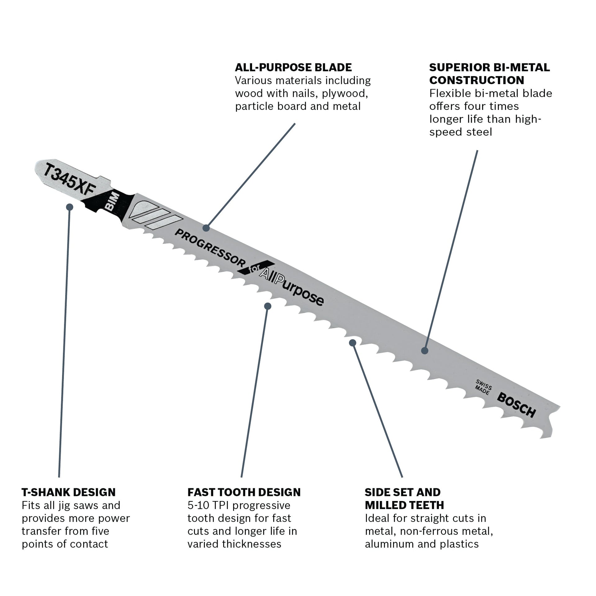 - BOSCH T345XF3 3 pc. 5-1/4 In. 5-10P TPI Progressor for Wood with Nails T-Shank Jig Saw Blades