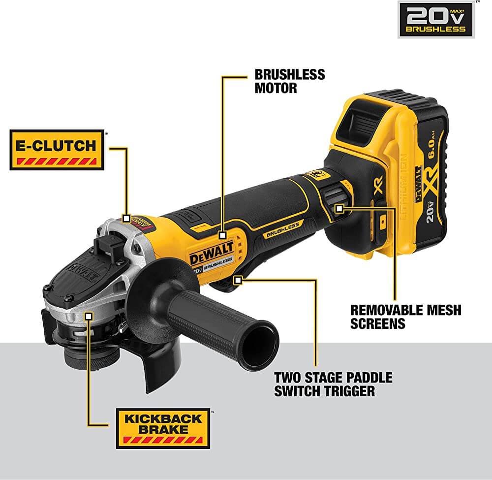 The small angle grinder has a brushless motor that elongates motor life and requires no time changing out worn brushes. The wheel stops within 2 seconds or less. Its Kickback Brake engages maximum force to stop the wheel when there is a pinch, stall, or bind-up to reduce kickback, and will shut off for further protection.