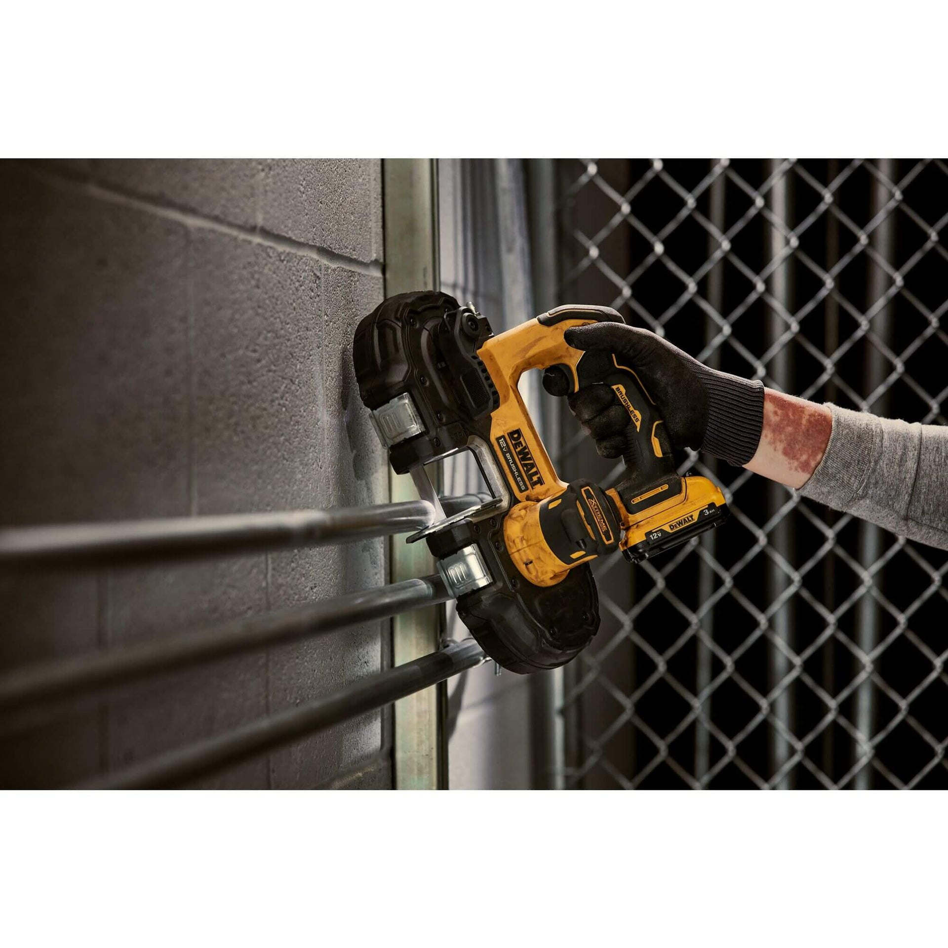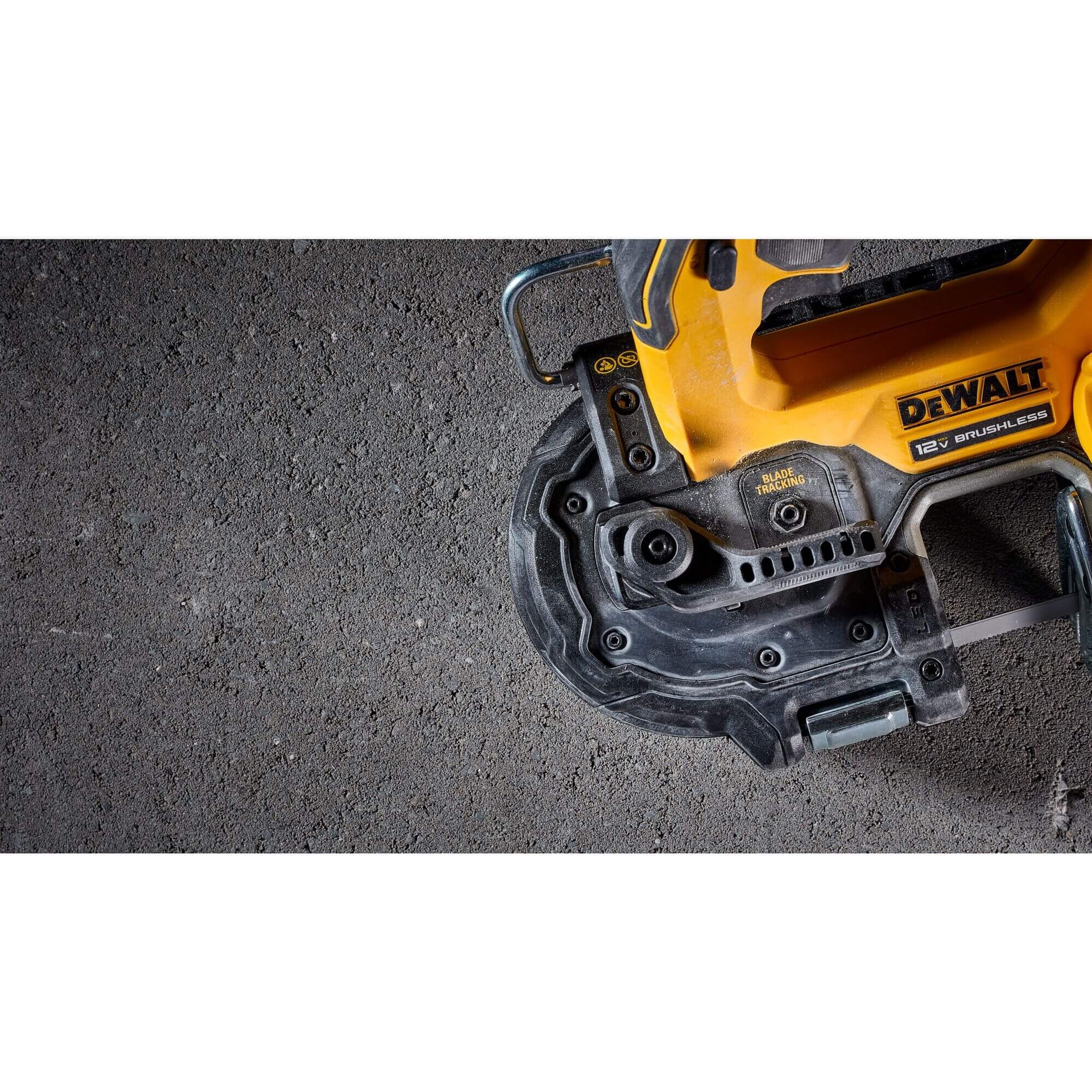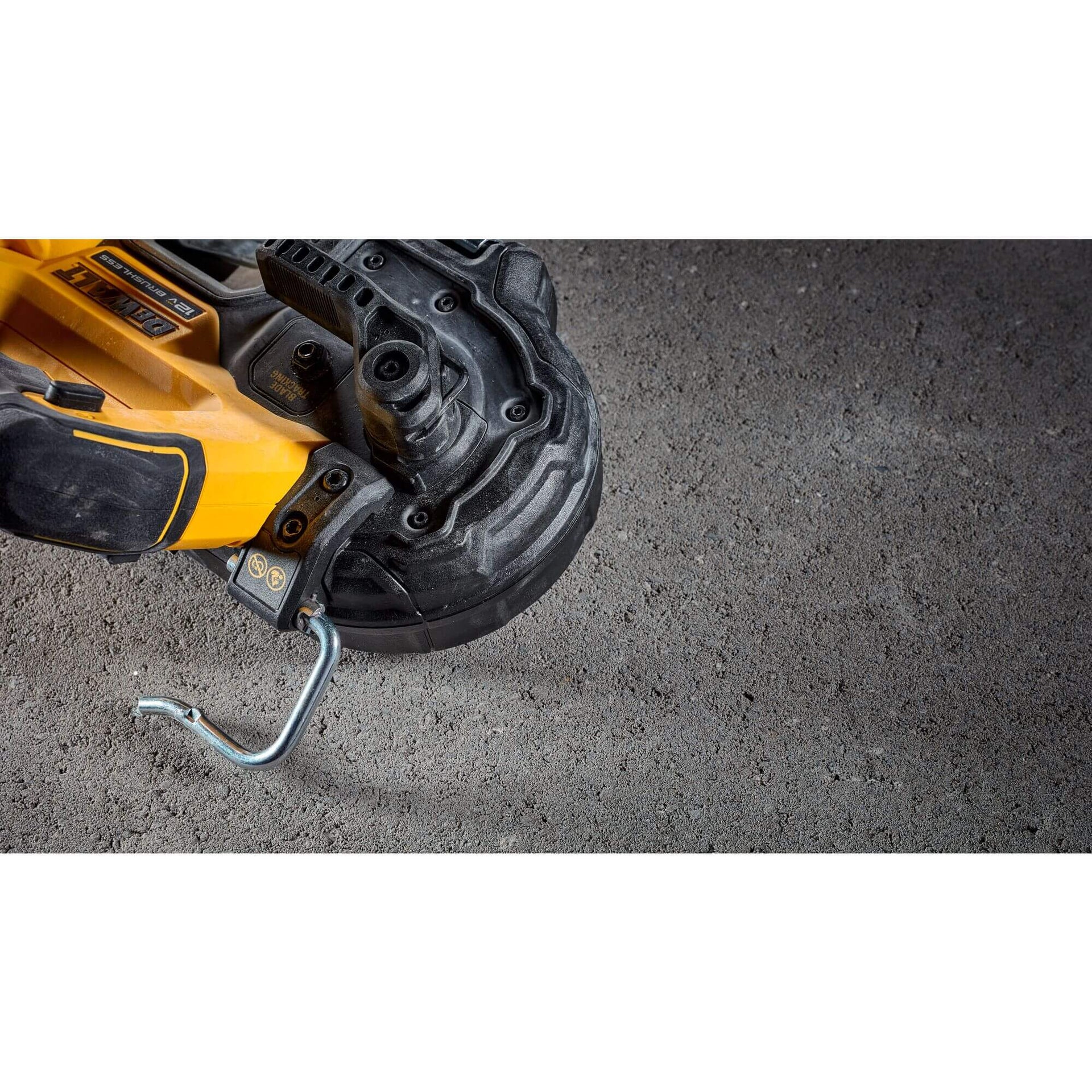 The compact XTREME 12V MAX* 1-3/4 in. Brushless Cordless Bandsaw is lightweight at 6.54 lbs. with an integrated guard making it ideal for overhead and one-handed cutting jobs. The 1-3/4 in. cut capacity allows for cuts through small metal diameters with additional room to cut 1-5/8 in. comfortably. The variable-speed trigger helps provide control when cutting through hard materials. For added ease of use, simply hang this bandsaw when you're ready to switch tasks with the integrated hook and illuminate dark workspaces with bright onboard LED.