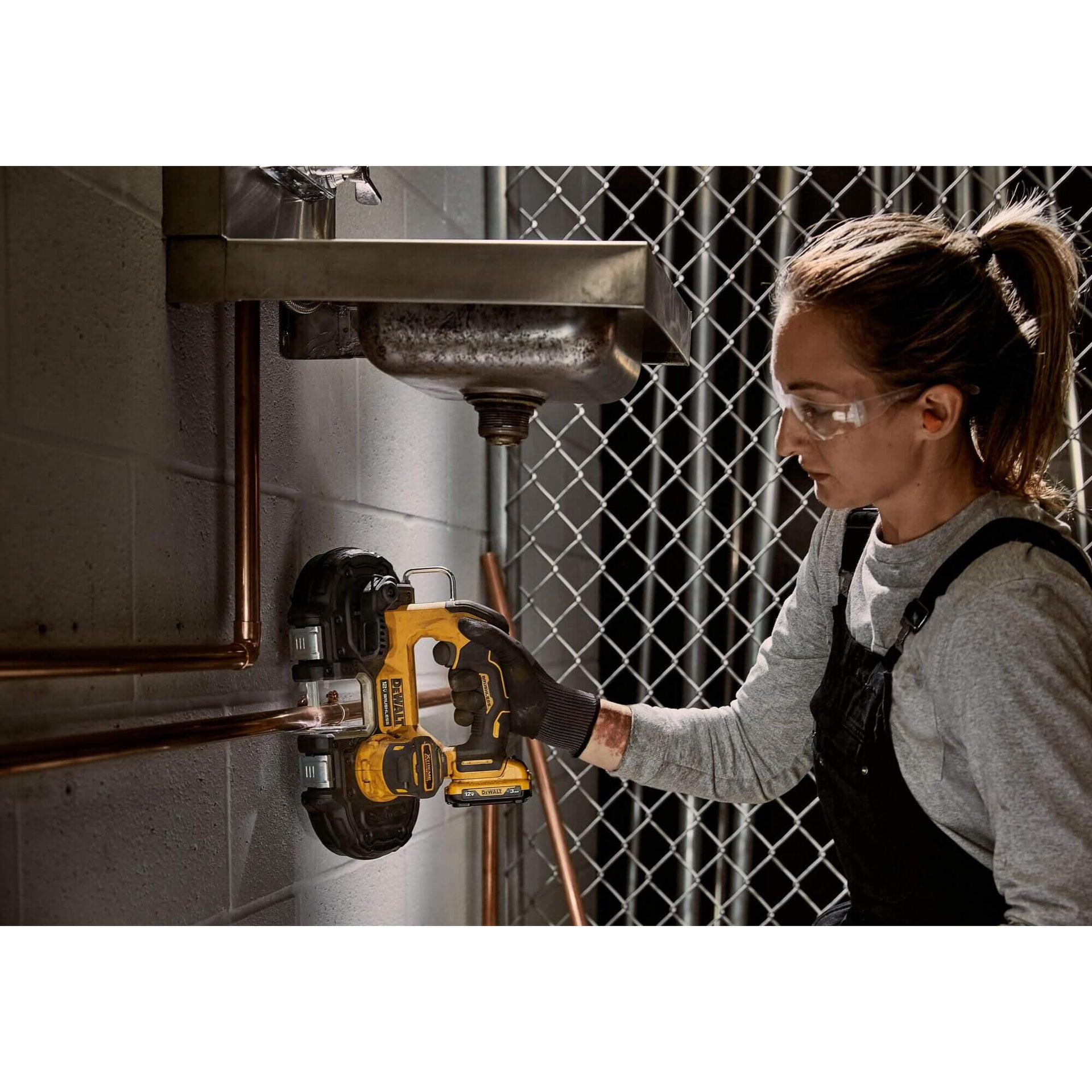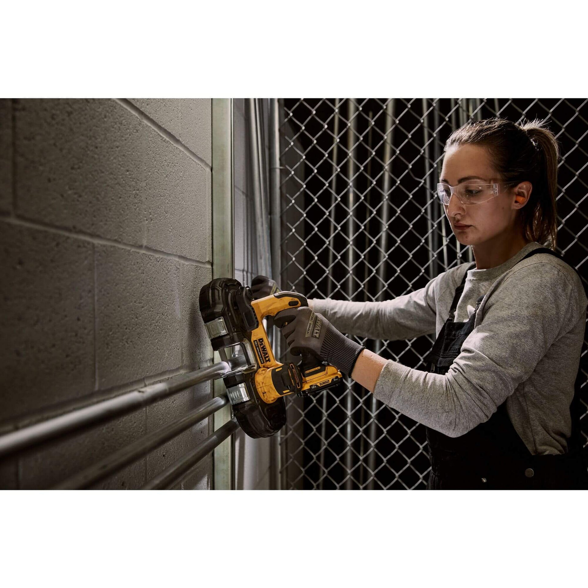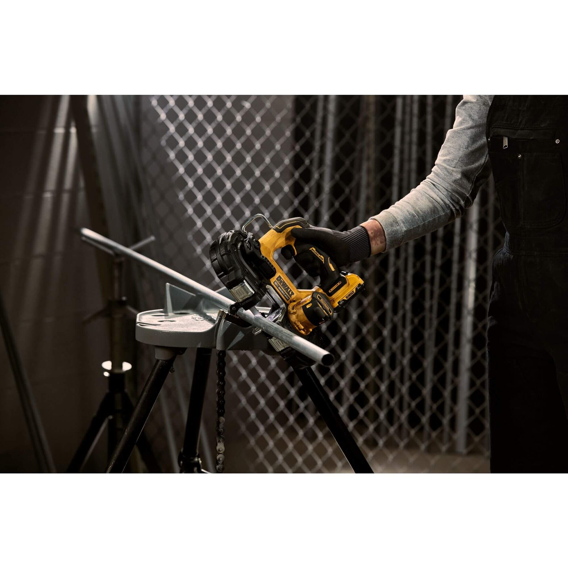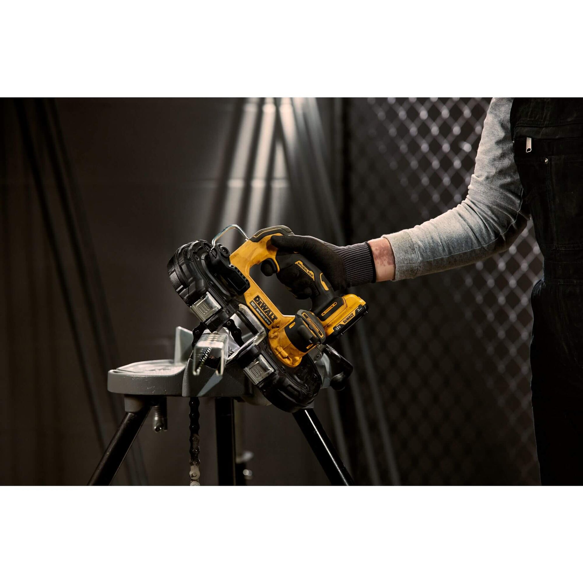 The compact XTREME 12V MAX* 1-3/4 in. Brushless Cordless Bandsaw is lightweight at 6.54 lbs. with an integrated guard making it ideal for overhead and one-handed cutting jobs. The 1-3/4 in. cut capacity allows for cuts through small metal diameters with additional room to cut 1-5/8 in. comfortably. The variable-speed trigger helps provide control when cutting through hard materials. For added ease of use, simply hang this bandsaw when you're ready to switch tasks with the integrated hook and illuminate dark workspaces with bright onboard LED.