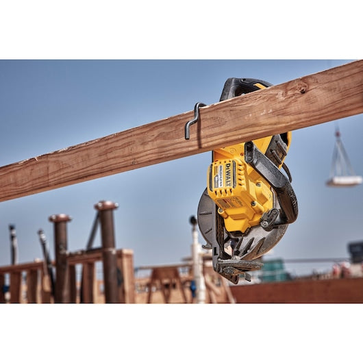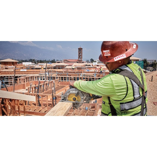 The FLEXVOLT 60V MAX* 7-1/4 in. Cordless Worm Drive Style Saw features a blade oriented to the left of the motor and the handle positioned at the rear of the saw to optimize line of sight when cutting. An electronic brake helps stop the blade after the trigger is released. Bevel capacity is 53° with stops at 45° and 22.5°. The saw achieves smooth, accurate cuts and long runtime with a durable, high-grade magnesium shoe and an efficient brushless motor..This Cordless Worm Drive Style Saw achieves 2-7/16 in. depth of cut at 90°. Hang the tool conveniently with the included rafter hook. This tool is also Tool Connect Tag-Ready™ so you can easily track it by attaching a Tool Connect™ Tag (Tag sold separately.) It's ideal for use in a variety of wood cutting applications such as oriented strand board (OSB), plywood, hardwoods, dimensional lumber, and flooring. Many of the professional contractors using this tool include framers, concrete formers, carpenters, and general contractors..DEWALT high powered cordless tools come standard with a 3-year limited warranty, 1-year free service contract and 90-day money-back guarantee.͍/ Purchase FLEXVOLT® 20V/60V MAX* batteries separately.