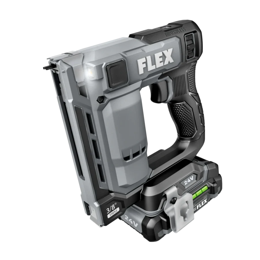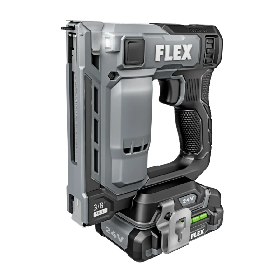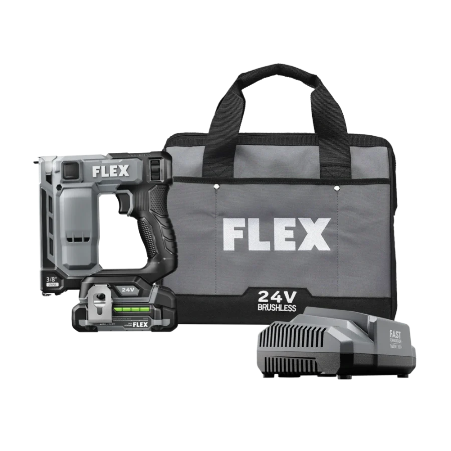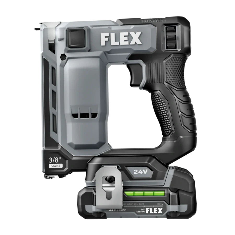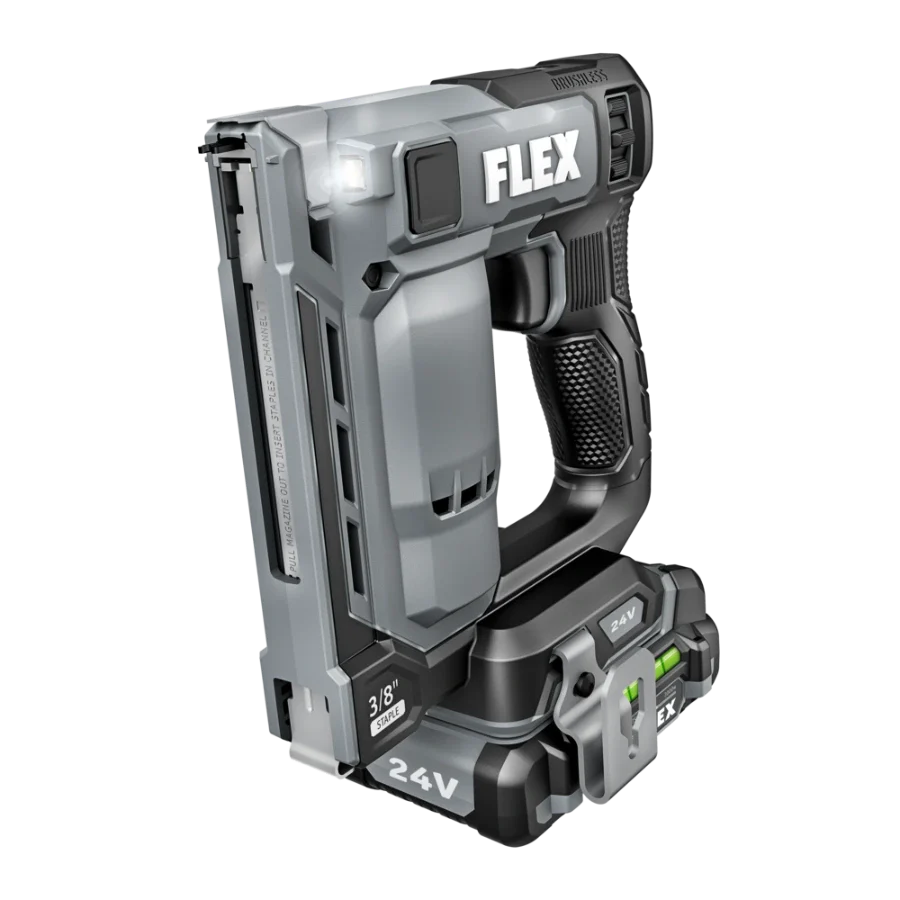 Power through installing Tyvek wrap, carpeting, and other jobs with the FLEX 24V Brushless 3/8” Stapler. This cordless stapler delivers high-speed power by driving up to 3 staples per second with zero ramp up time. It drives up to 5,000 staples on a single charge with a 2.5Ah lithium-ion battery for extended runtime. The staple gun features a power adjustment dial to easily set the ideal depth when driving fasteners, and its dual LED worklight delivers better visibility in dark work areas. The cordless staple gun toggles between bump and sequential firing modes and has a staple indicator to easily see how many staples remain in the magazine. Dry-fire lockout avoids blank firing and damage to your work when the staple supply is exhausted. The cordless stapler is compact and lightweight to conquer tight spaces with minimal fatigue. Its belt clip can be mounted on either side of the tool and features a lead-in profile. The stapler accepts 3/8-inch crown size fasteners. This cordless stapler delivers the FLEX Advantage of unmatched battery power, runtime, and fast charging. Kit includes the 3/8-inch stapler, 2.5Ah lithium battery, 160W Fast Charger, belt clip, (3) no-mar tips, and a FLEX bag. It’s all protected by the FLEX Limited Lifetime Warranty when registered within 30 days of purchase at registermyFLEX.com through December 31, 2024.
