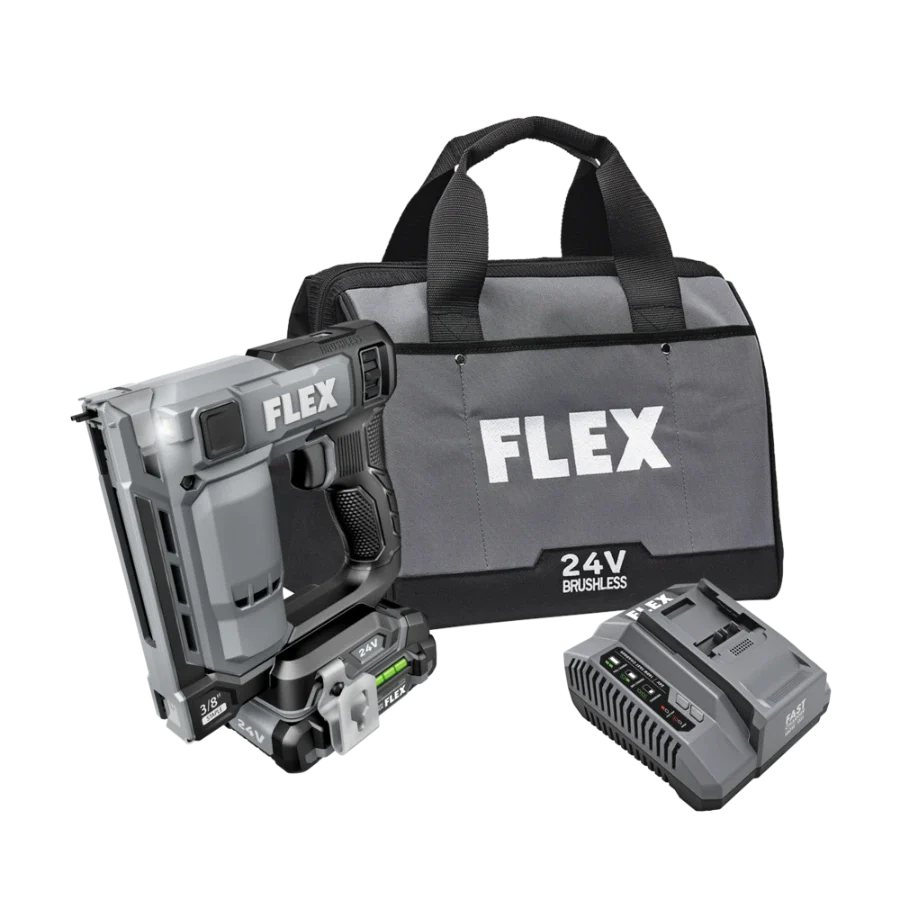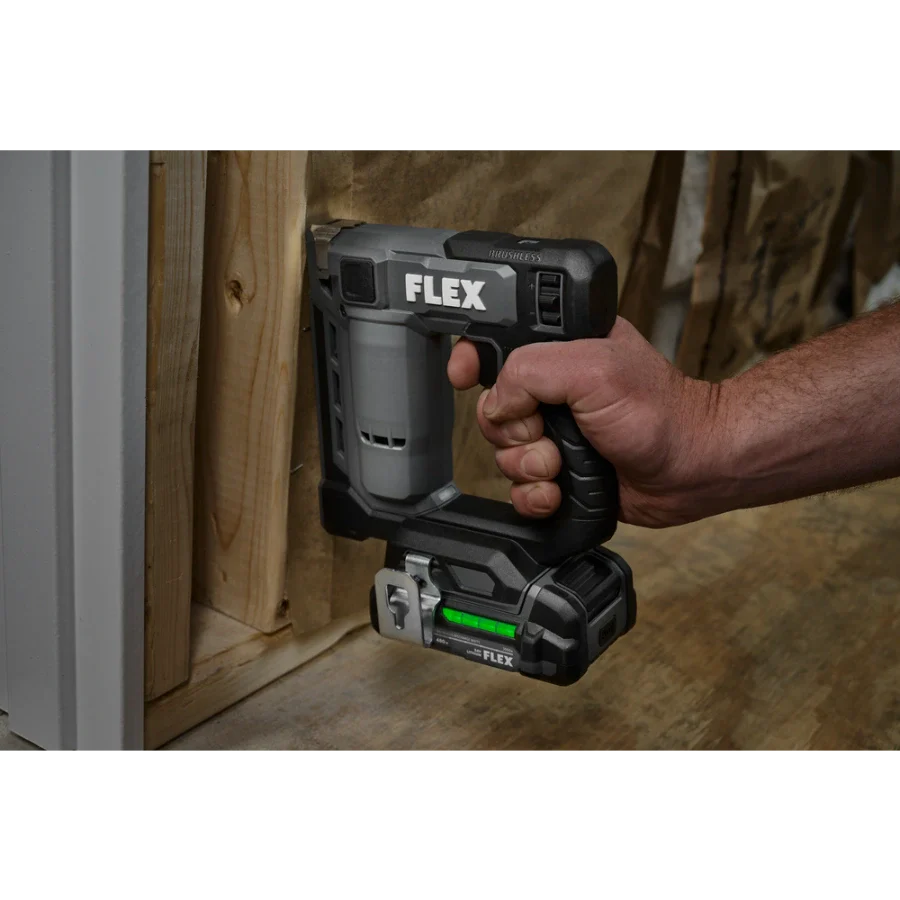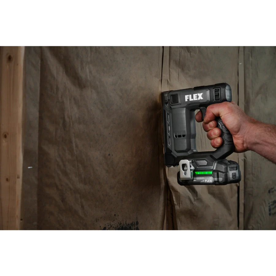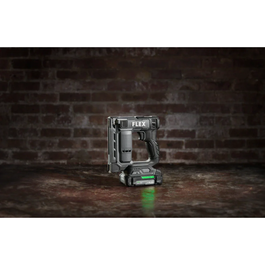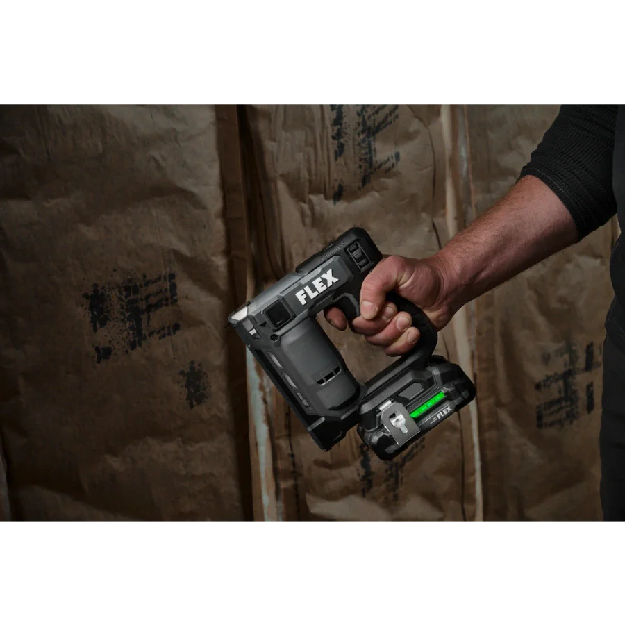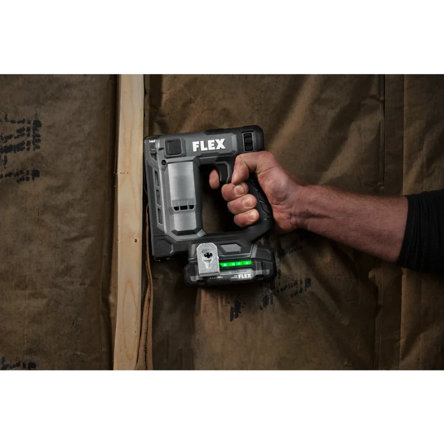 Power through installing Tyvek wrap, carpeting, and other jobs with the FLEX 24V Brushless 3/8” Stapler. This cordless stapler delivers high-speed power by driving up to 3 staples per second with zero ramp up time. It drives up to 5,000 staples on a single charge with a 2.5Ah lithium-ion battery for extended runtime. The staple gun features a power adjustment dial to easily set the ideal depth when driving fasteners, and its dual LED worklight delivers better visibility in dark work areas. The cordless staple gun toggles between bump and sequential firing modes and has a staple indicator to easily see how many staples remain in the magazine. Dry-fire lockout avoids blank firing and damage to your work when the staple supply is exhausted. The cordless stapler is compact and lightweight to conquer tight spaces with minimal fatigue. Its belt clip can be mounted on either side of the tool and features a lead-in profile. The stapler accepts 3/8-inch crown size fasteners. This cordless stapler delivers the FLEX Advantage of unmatched battery power, runtime, and fast charging. Kit includes the 3/8-inch stapler, 2.5Ah lithium battery, 160W Fast Charger, belt clip, (3) no-mar tips, and a FLEX bag. It’s all protected by the FLEX Limited Lifetime Warranty when registered within 30 days of purchase at registermyFLEX.com through December 31, 2024.