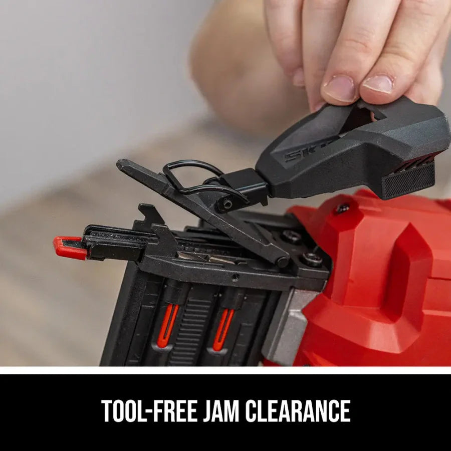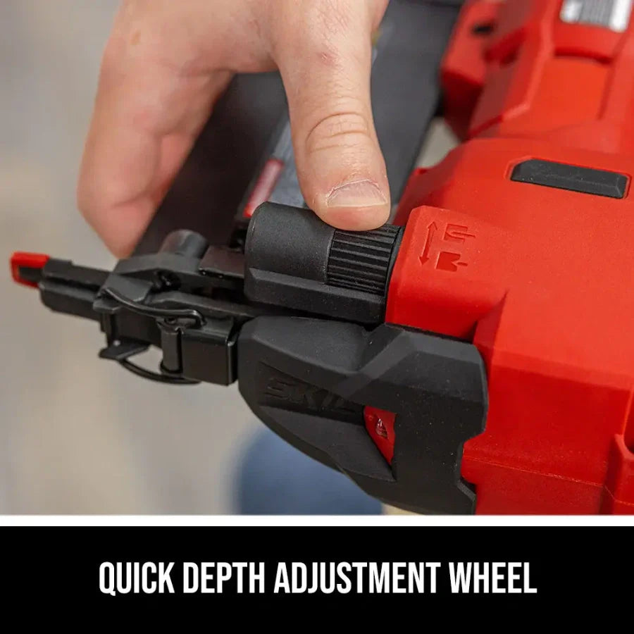Ditch the hoses and compressors with the cordless SKIL PWRCORE 20™ Brushless 20V 18Ga Brad Nailer Kit. This 20V cordless nailer delivers best-in-class runtime by driving up to 1,000 nails on a single charge with the included 2.0Ah battery. It features a powerful brushless motor that drives up to two nails per second with minimal ramp-up time. Dual LED lights help increase visibility when working with the nail gun in dimly lit work areas. Its quick depth adjustment wheel allows you to easily set the ideal nailing depth when driving fasteners, and the battery-powered nail gun is compact and lightweight for working in tight spaces with minimal fatigue. Choose between sequential and bump modes with the mode select switch. Dry fire lockout eliminates blank firing and prevents damage to work surfaces, while tool-free jam clearance offers easy access to clear nails in case of a jam. The finish nailer accepts 5/8-inch to 2-1/8-inch 18-gauge fasteners.