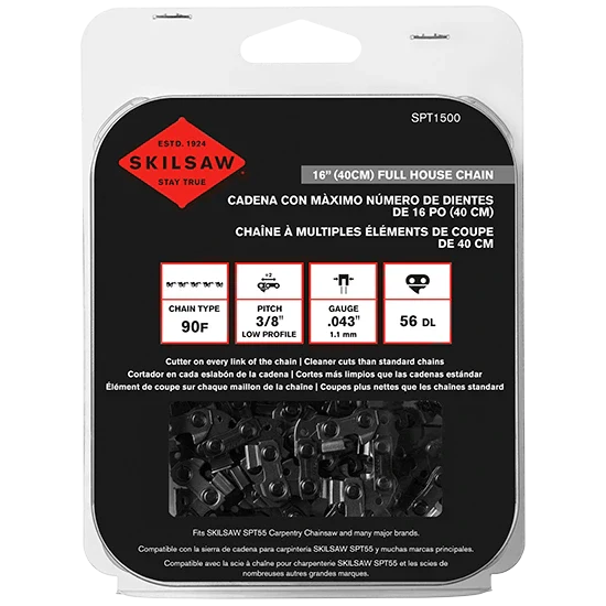 Full house chain has a cutting tooth on every link—twice as many as on a standard chain—to deliver superior precision and clean, accurate cuts. Designed for compatibility with SPT55 16 IN. Worm Drive Carpentry Chainsaw.